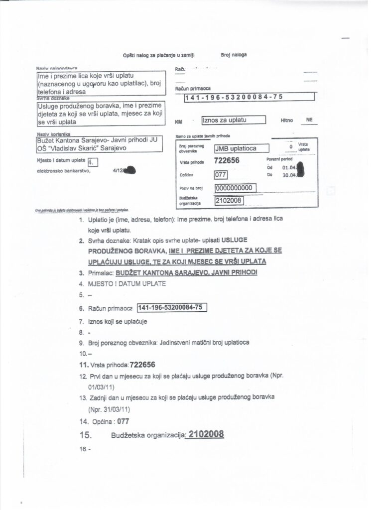 Poštovani/e, u prilogu je primjer uplatnice za plaćanje usluga produženog boravka škole. Odlukom Vlade Kantona Sarajevo i ove školske godine je obezbjeđeno sufinansiranje plaćanja usluga produženog boravka za učenike od prvog do četvrttog razreda. Cijena usluge za učenike od prvog do četvrtog razreda je 140, 00 KM